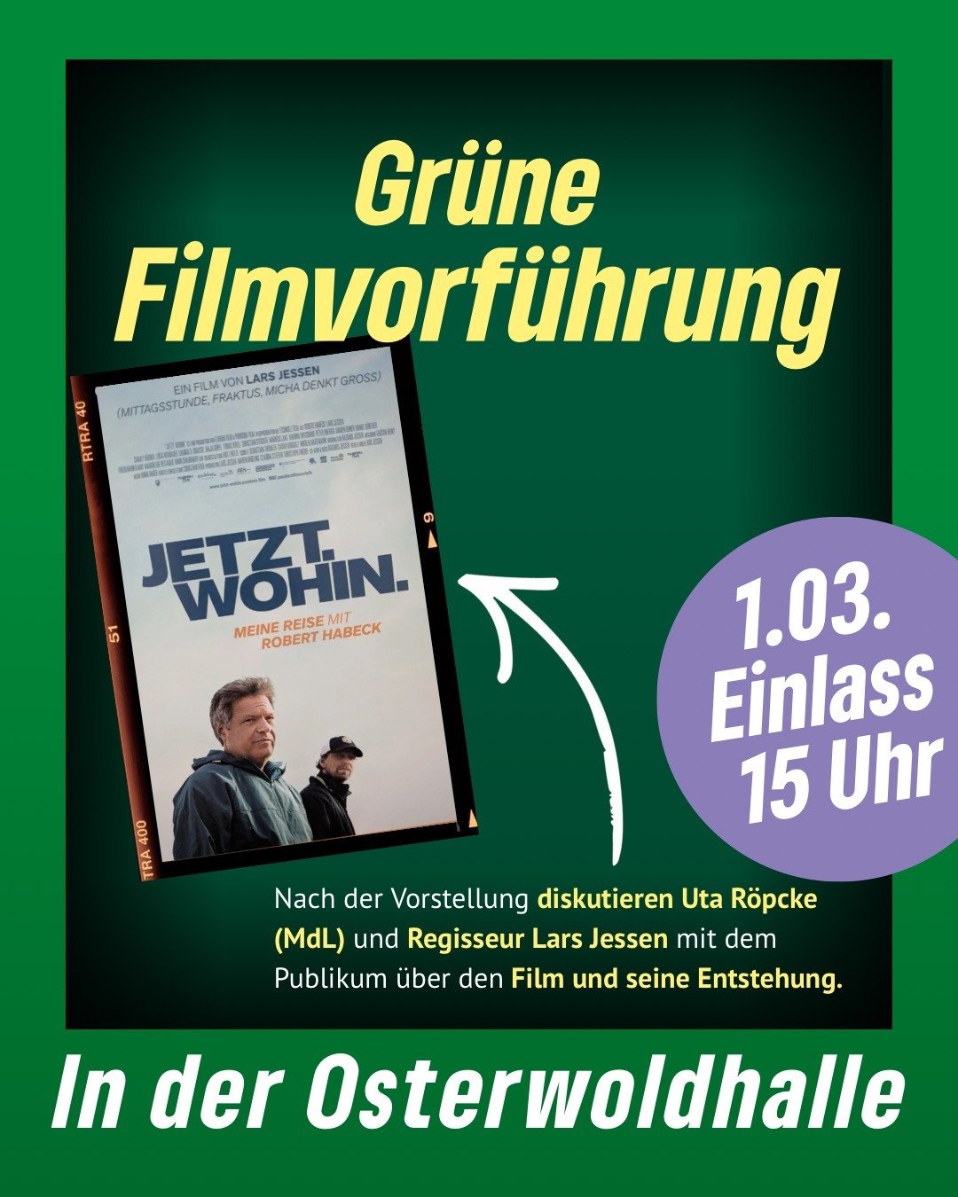 Der Grüne OV Lauenburg/Amt Lütau und Oliver Brandt (MdL) laden am Sonntag, den 1. März ein zu einer Filmvorführung von „JETZT. WOHIN. – Meine Reise mit Robert Habeck“.